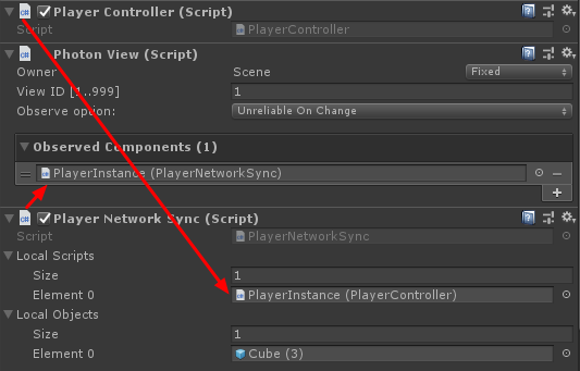 }- Fügen Sie das PlayerNetworkSync.cs-Skript zur PlayerInstance hinzu und weisen Sie es den PhotonView Observed Components zu.
