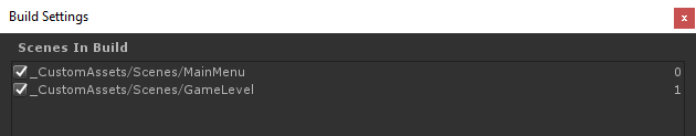- Fügen Sie sowohl MainMenu als auch GameLevel zu den Build-Einstellungen hinzu.