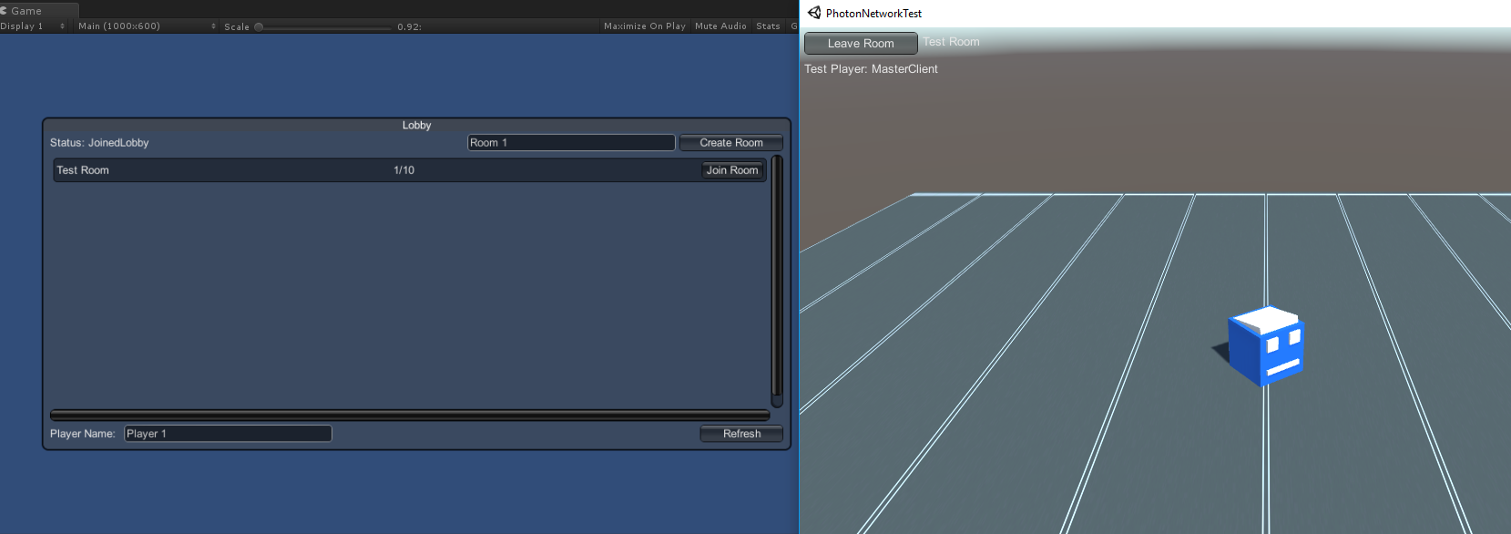 }Und eine einfache Benutzeroberfläche mit einer "Leave Room"-Schaltfläche und einigen zusätzlichen Elementen wie dem Raumnamen und der Liste der verbundenen Spieler: