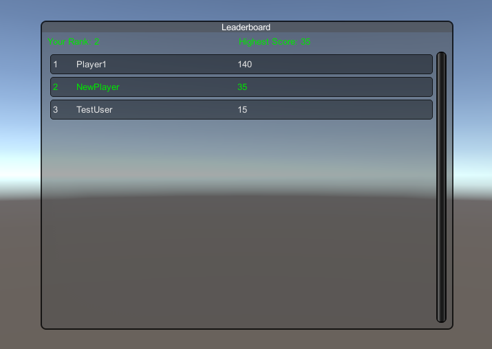 LeaderboardUser[] leaderboardUsers;HINWEIS: Die Variable currentScore ist die Variable, die Sie im Spiel verwenden werden, um die Punktestände der Spieler zu verfolgen. Dieser Wert wird an den Server übermittelt und in der Datenbank gespeichert. Es wird empfohlen, diesen Wert zum Schutz vor Hackerangriffen zu verschleiern.